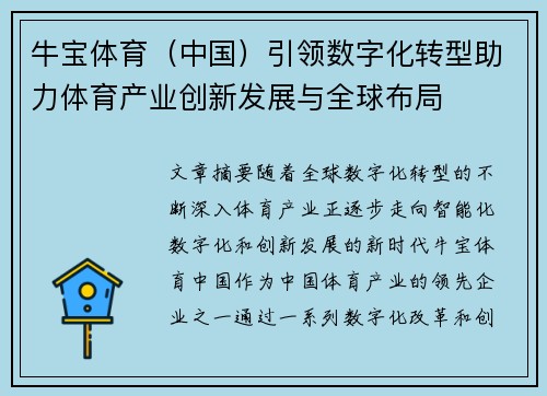 随着全球数字化转型的不断深入,体育产业正逐步走向智能化、数字化和创新发展的新时代。牛宝体育(中国)作为中国体育产业的领先企业之一,通过一系列数字化改革和创新举措,引领着体育产业向着更高效、科技化、全球化的方向迈进。本文将围绕牛宝体育(中国)如何通过数字化转型推动体育产业的创新发展与全球布局展开讨论。文章从四个方面进行详细阐述:首先,探讨数字化技术如何优化体育产业的业务流程;其次,分析数字化转型如何增强体育产业的互动性与观众体验;然后,阐述牛宝体育在全球布局中的战略与实践;最后,讨论数字化转型在促进体育产业可持续发展中的关键作用。通过这些层面的分析,揭示牛宝体育如何在体育产业中创造新的商业模式、提升产业价值并走向全球化未来。