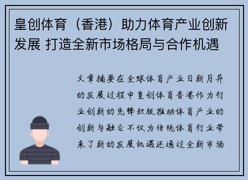 在全球体育产业日新月异的发展过程中,皇创体育(香港)作为行业创新的先锋,积极推动体育产业的创新与融合,不仅为传统体育行业带来了新的发展机遇,还通过全新市场格局的打造,为体育产业注入了强大的活力和竞争力。本文从四个方面详细探讨了皇创体育(香港)如何通过技术创新、市场合作、品牌建设与全球化战略等方面推动体育产业的变革。首先,本文分析了技术创新对体育产业的推动作用,阐述了体育科技如何提升用户体验和产业效率;其次,着重探讨了市场合作在促进资源整合与跨界合作方面的重要性,并具体分析了皇创体育(香港)如何搭建合作平台;然后,本文详细介绍了品牌建设在体育产业中不可忽视的作用,特别是如何通过品牌差异化提升市场竞争力;最后,本文还会分析全球化战略如何帮助体育产业拓展国际市场,推动产业走向全球化发展。通过这些方面的深入探讨,本文旨在为体育产业未来的创新发展提供参考与启示。